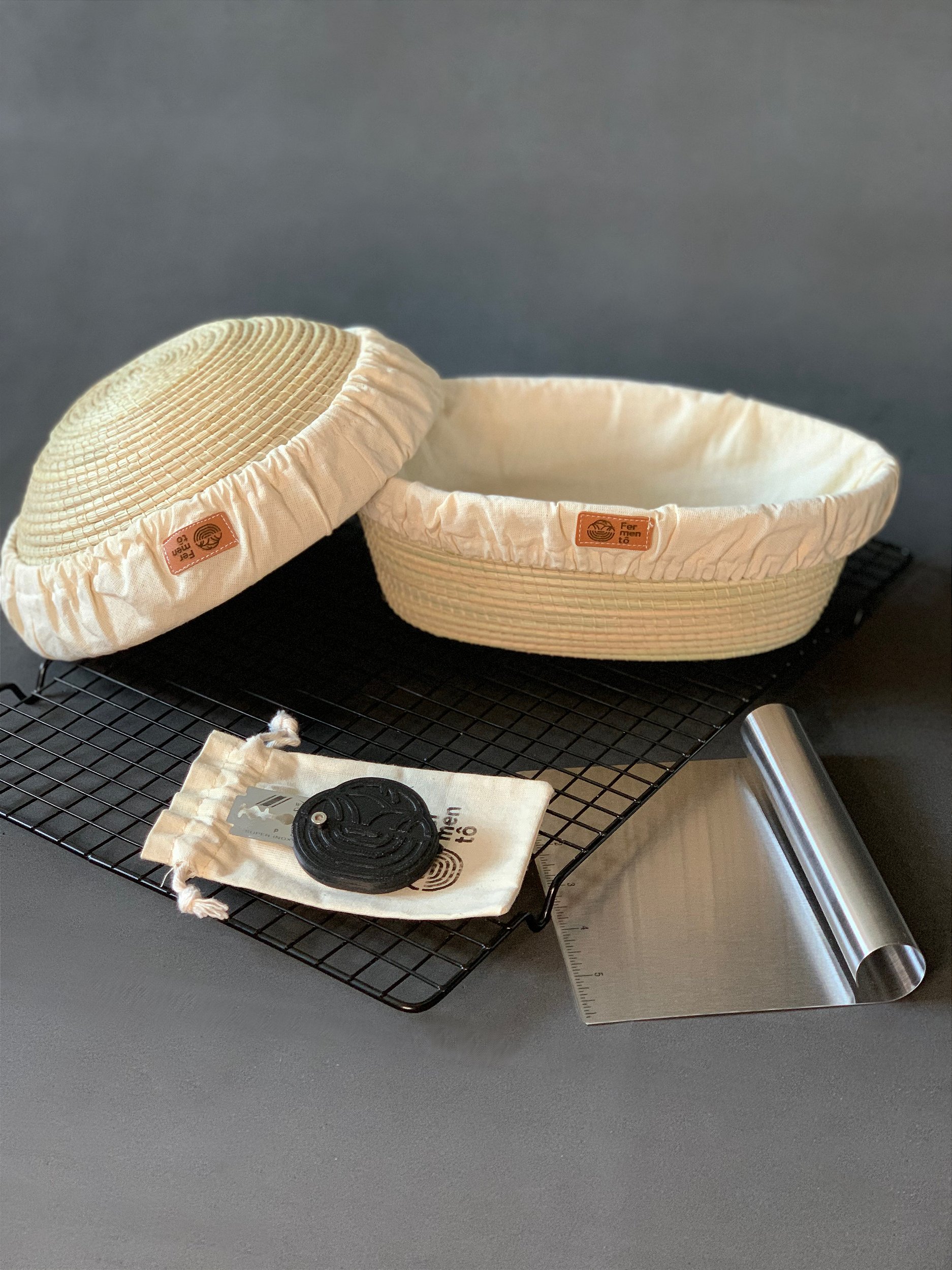 Cestos de fermentação em fibra natural de licuri para pães de longa fermentação. Acompanham toucas 100% algodão compatíveis com os modelos. Espátula em inox para cortar e manusear as massas (pães, pizza, foccacia…) e legumes. Grade antiaderente para resfriamento homogêneo do pão. Risca pão com parafuso inox e lâmina descartável.