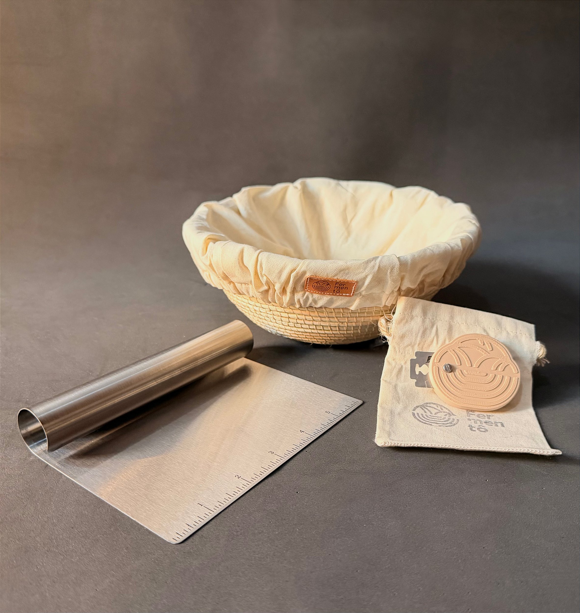 Cesto de fermentação em fibra natural de licuri para pães de longa fermentação. Acompanha touca 100% algodão compatível com o modelo. Espátula em inox para cortar e manusear as massas (pães, pizza, foccacia…) e legumes. Risca pão com parafuso inox e lâmina descartável.